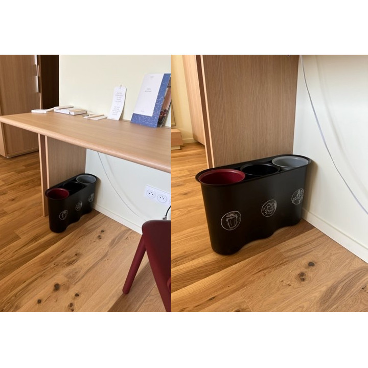 L’Association de produits : Pour les espaces plus vastes, couplez l’utilisation de corbeilles individuelles Trio avec des poubelles de tri de plus grande capacité pour centraliser les flux en fin de journée.